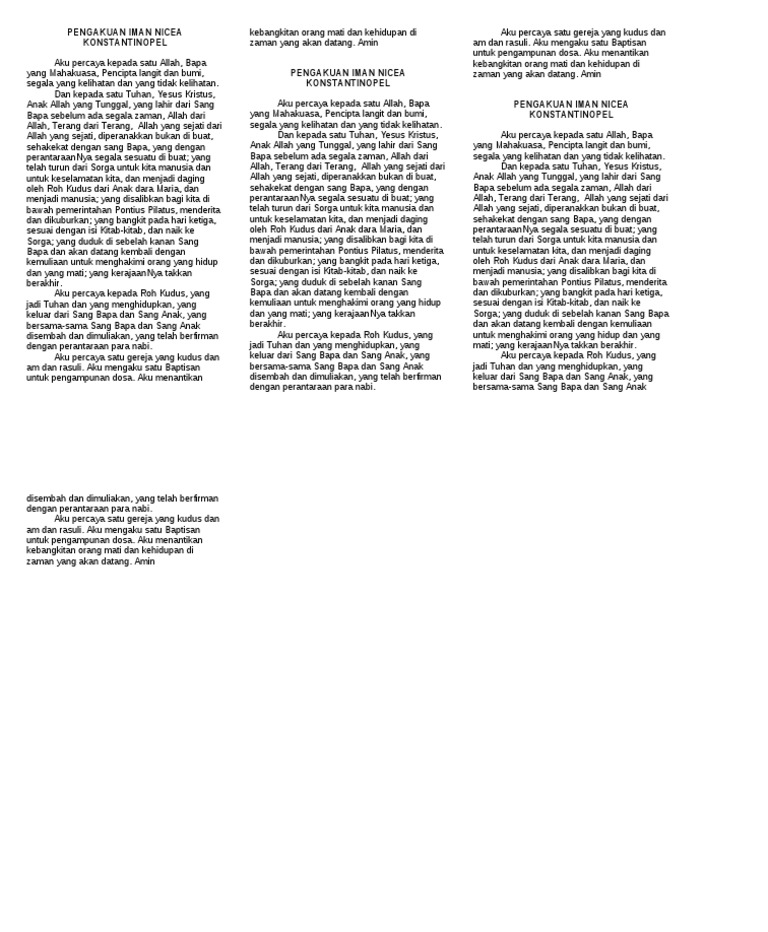 Dalam praktiknya gki mengakui pengakuan iman rasuli, pengakuan iman nicea jadi, di satu sisi, dengan mengakui ketiga pengakuan iman tersebut, gki mau mengikatkan diri pada persekutuan. Pengakuan iman rasuli aku percaya kepada allah, bapa yang. Aku percaya kepada satu allah, bapa yang mahakuasa, pencipta langit dan bumi, segala yang kelihatan dan yang tidak kelihatan. Katekismus heidelberg, pengakuan iman westminster, pengakuan iman belgic, canons of dort. Pengakuan iman nicea (bahasa inggeris: